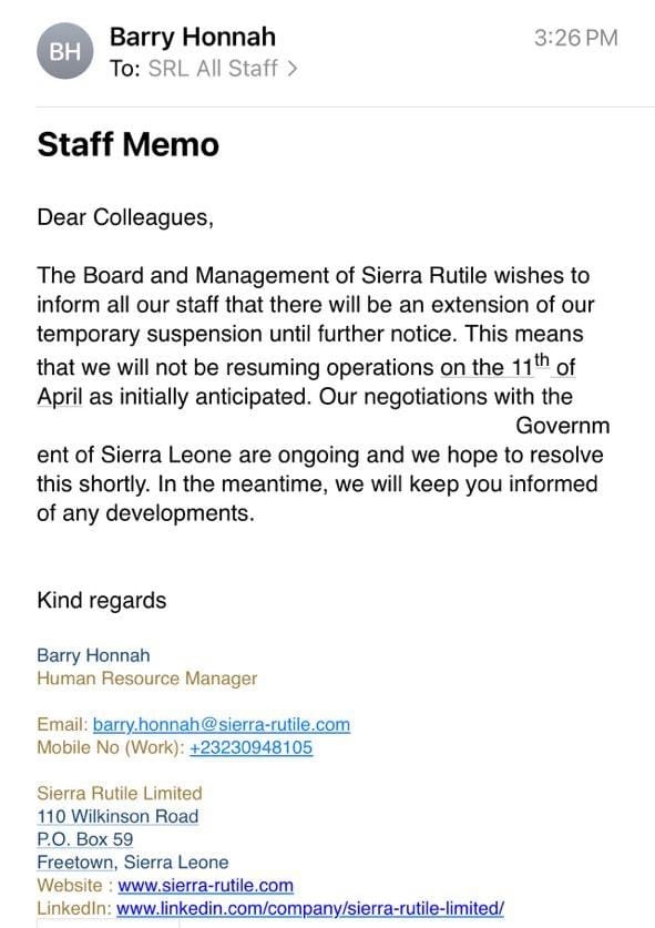 The management of Sierra Rutile Holding Limited has announced an extension of the temporary suspension for all staff until further notice. The decision, was communicated through a staff memo from the Board and Management.