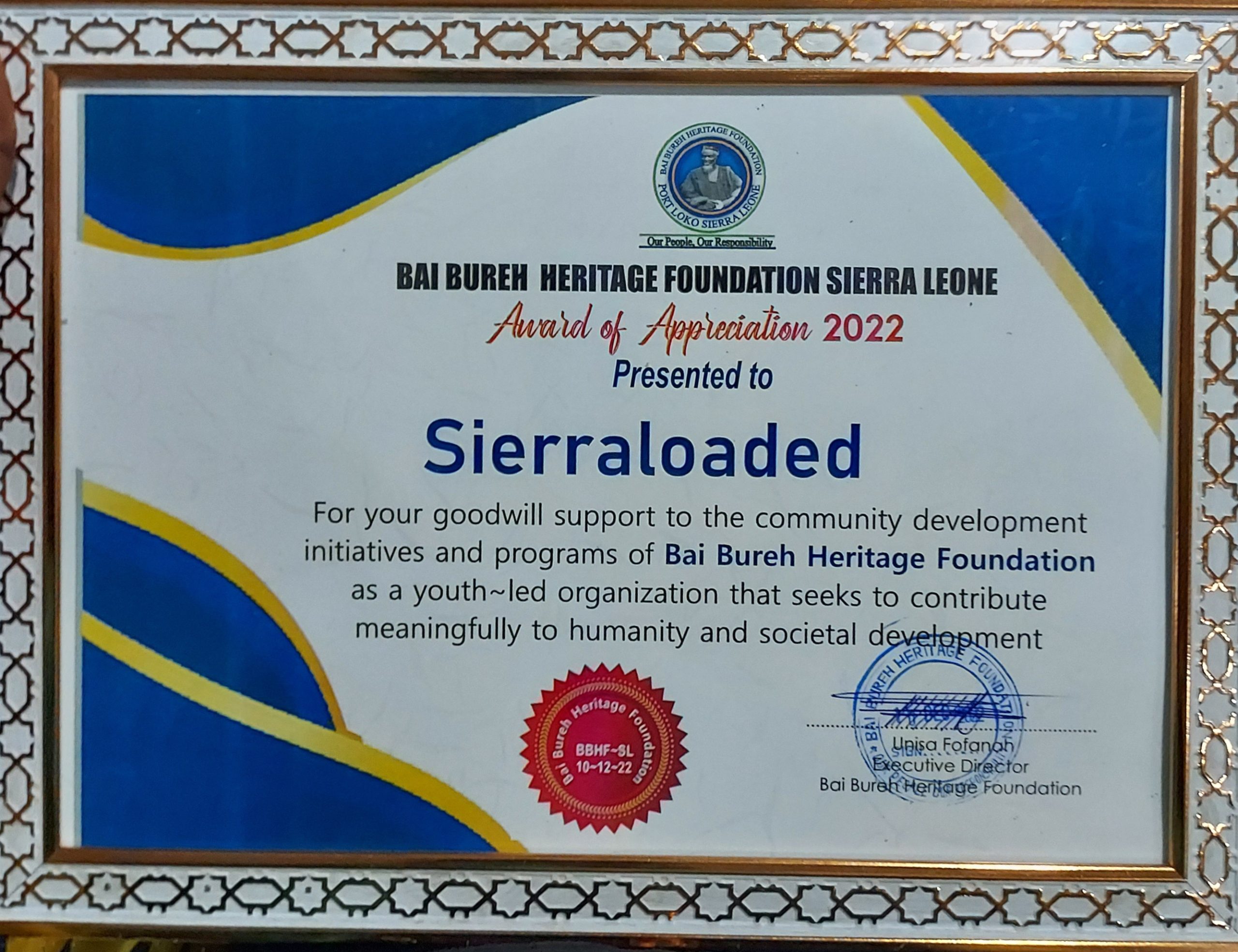 Sierra Leone’s leading Digital Media Platform, Sierraloaded has been recognized and appreciated by the Bai Bureh Heritage Foundation for its selfless support to the community development initiatives and programs of the Bai Bureh Heritage Foundation, as a youth-led organization that seeks to contribute meaningfully to humanity and societal development.