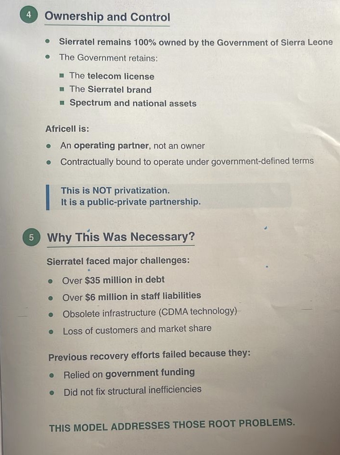 “The partnership will run for 10 years, with an option for a five-year renewal, and it will be reviewed every five years based on performance,” she said. “It is structured to promote affordability and competition while allowing Sierratel to provide voice, data, and mobile money services under a revenue-sharing arrangement.”