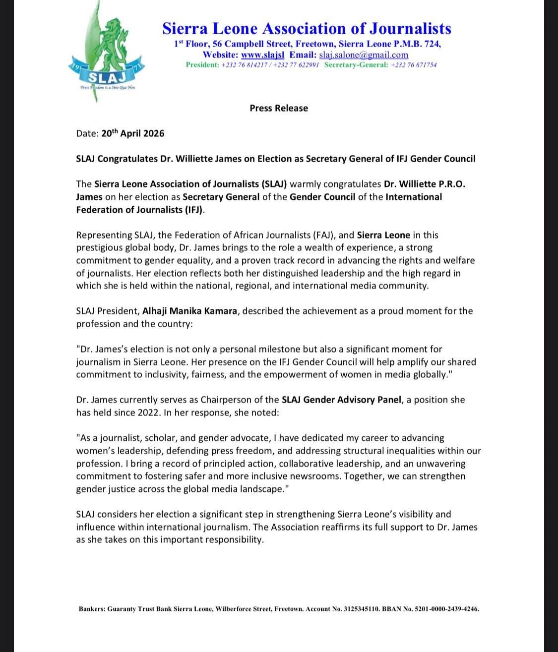 The Sierra Leone Association of Journalists (SLAJ) has congratulated Dr. Williette P.R.O. James on her election as Secretary General of the Gender Council of the International Federation of Journalists (International Federation of Journalists), describing her elevation as a significant achievement for Sierra Leone and the global media community.