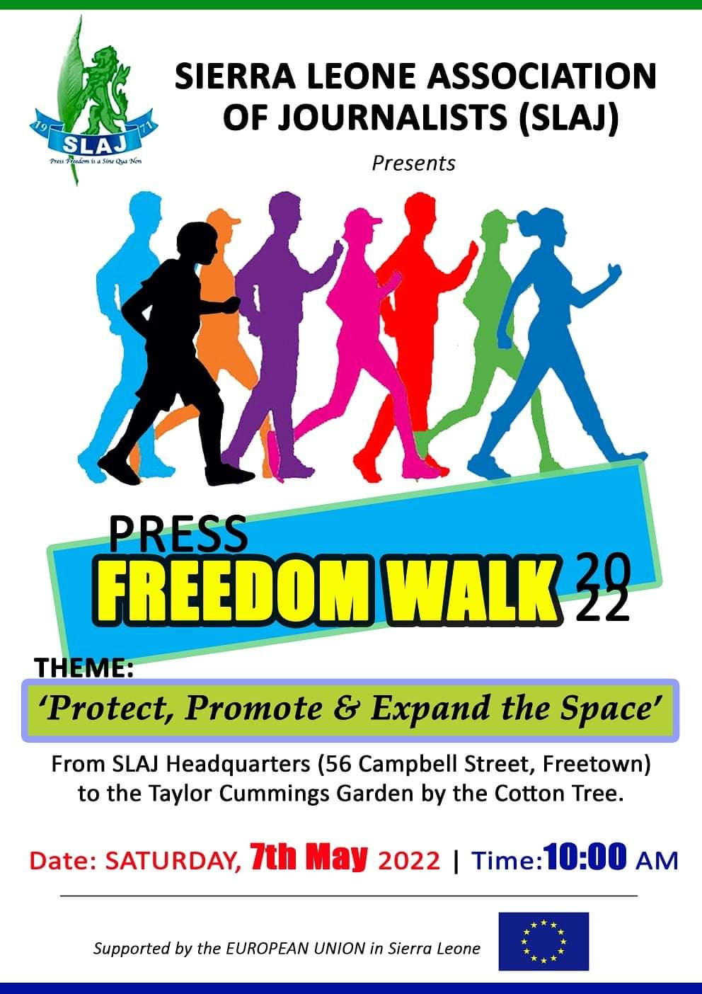 The Sierra Leone Association of Journalists (SLAJ), with support from the European Union Sierra Leone, will mark this year’s World Press Freedom Day with a Press Freedom Walk (WPD) 2022 under the theme: ‘Protect, Promote & Expand the Space’ to reflect on the historic repeal of the criminal libel law in 2020, a milestone which set a positive dynamic and an enabling framework for the protection and promotion of freedom of opinion and expression, including press freedom, and the civic space in Sierra Leone.