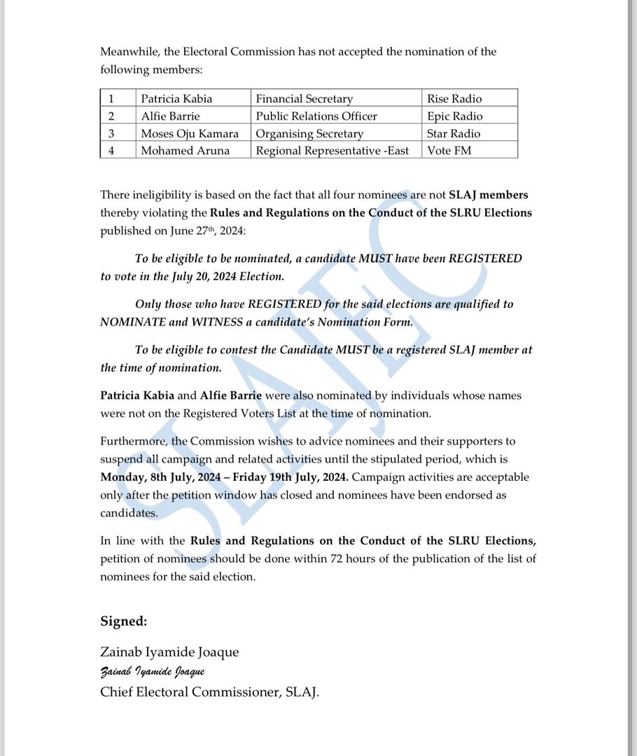 The Chief Electoral Commissioner also revealed that the Commission have not accepted the nomination of some members based on the fact that all four nominees are not SLAJ members thereby violating the Rules and Regulations on the Conduct of the SLRU Elections published on June 27th, 2024. The four members are; Patricia Kabia of Rise Radio who aspired for the position of Financial Secretary, Alfie Barrie of Epic Radio who applied for the position of Public Relations Officer, Moses Oju Kamara of Star Radio who applied for the position of Organising Secretary and Mohamed Aruna of VOTE FM who applied for the position of Regional Representative –East.