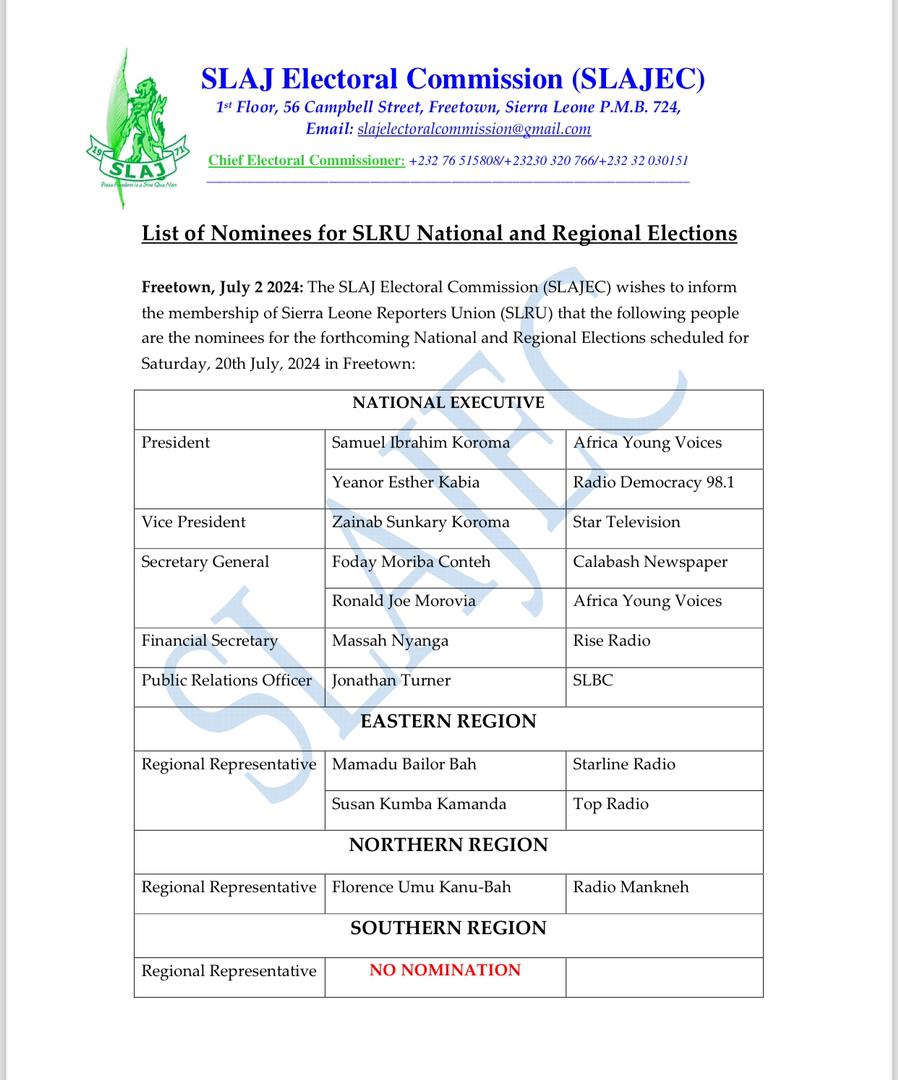 Following the pending election of the Sierra Leone Reporters Union- SLRU slated for the 20th July, 2024 in Freetown, the Chief Electoral Commissioner-SLAJ, Zainab Iyamide Joaque released the list of nominees for the SLRU National and Regional Elections in the country.