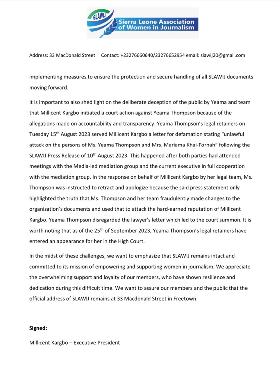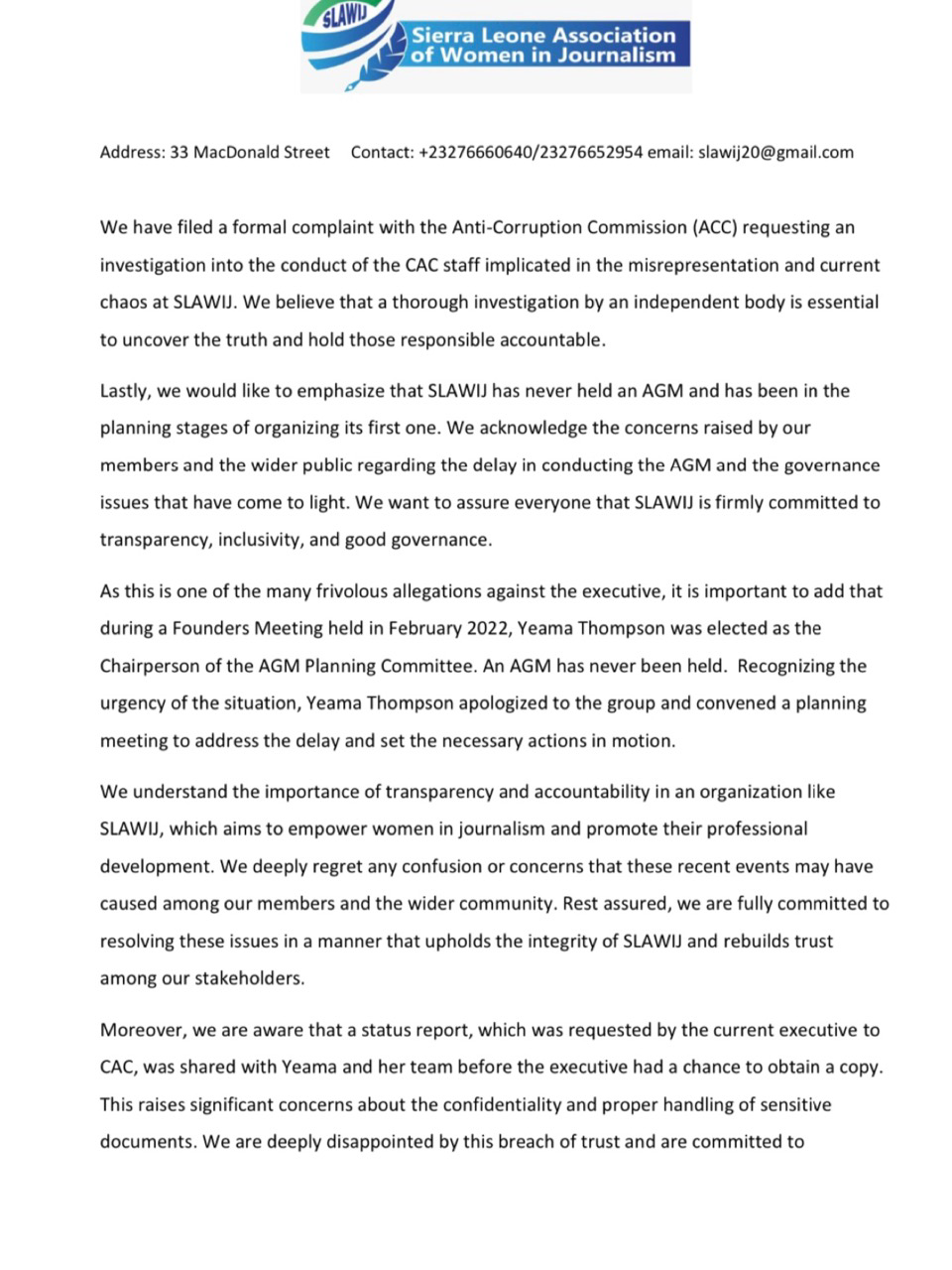 The Sierra Leone Association of Women in Journalism (SLAWIJ), led by Millicent Kargbo, is taking resolute steps to resolve an ongoing leadership conflict in the association.