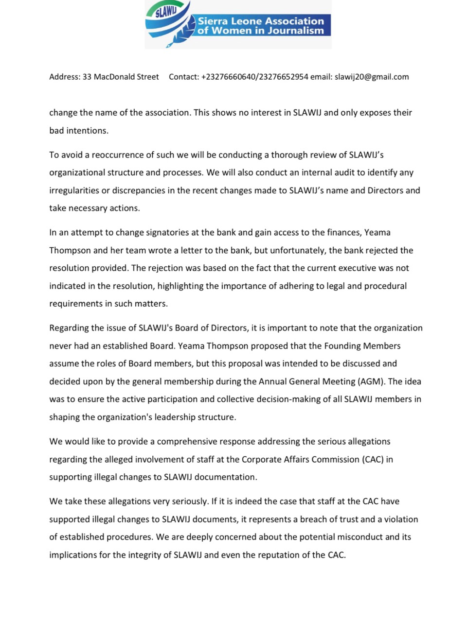 Furthermore, with a membership exceeding 100 women from diverse backgrounds, SLAWIJ has made substantial strides in promoting women’s roles in journalism throughout Sierra Leone. Nevertheless, recent unauthorized alterations to SLAWIJ’s name and board by directors Mariama Khai-Fornah and Yeama Thompson have raised concerns about their dedication and intentions towards SLAWIJ’s mission.