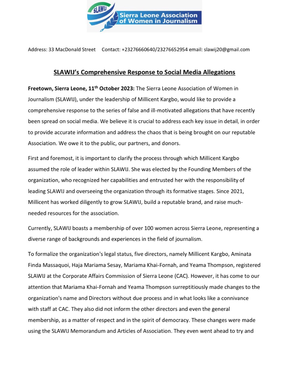 According to the press statement, the core issue revolves around the process of Millicent Kargbo assuming her role as the leader of SLAWIJ. Since 2021, Kargbo has been relentless in her efforts to expand the organization, establish a strong brand, and secure vital resources.