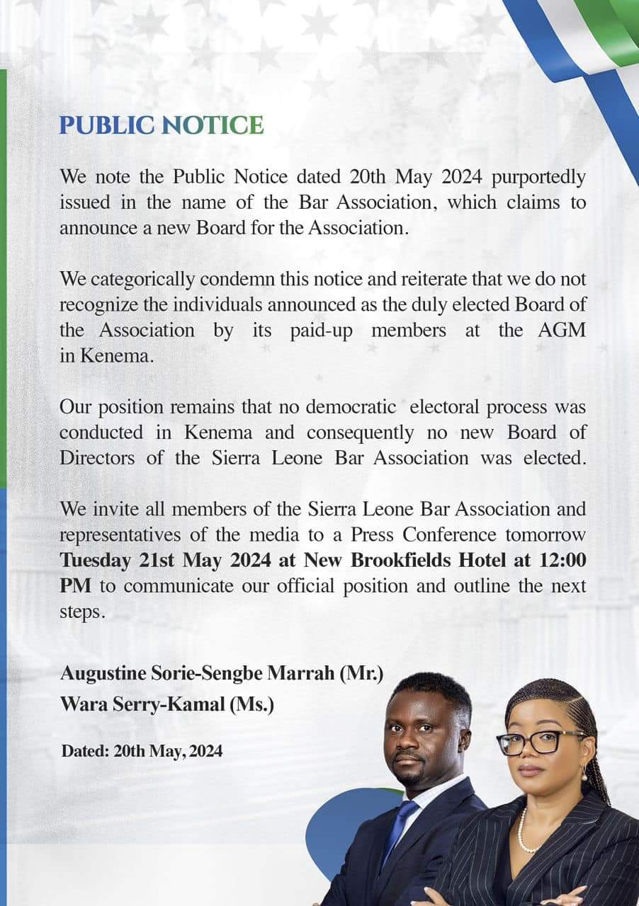 In their notice, Marrah and Seray-Kamal stated that they do not recognize the individuals announced as the new Board of the Sierra Leone Bar Association on May 20, 2024.