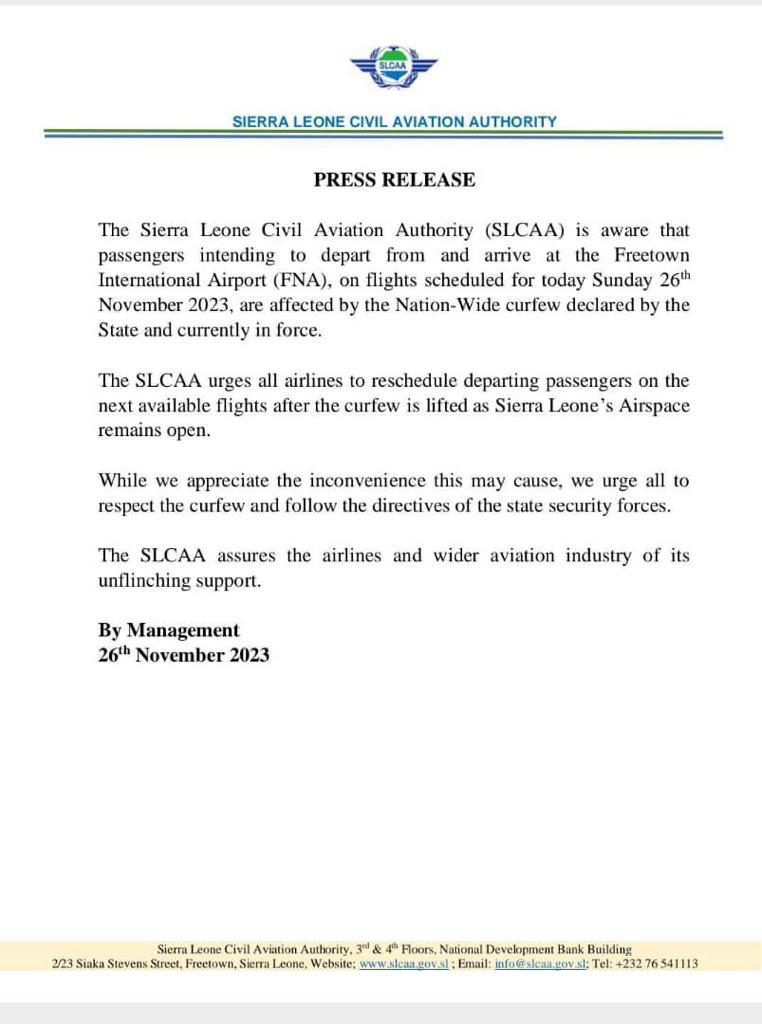Due to the State-declared nationwide curfew, currently in effect, the SLCAA urges airlines to reschedule departing passengers once the curfew is lifted. Despite the tense situation, Sierra Leone’s airspace remains open, and the SLCAA is committed to supporting the aviation industry.