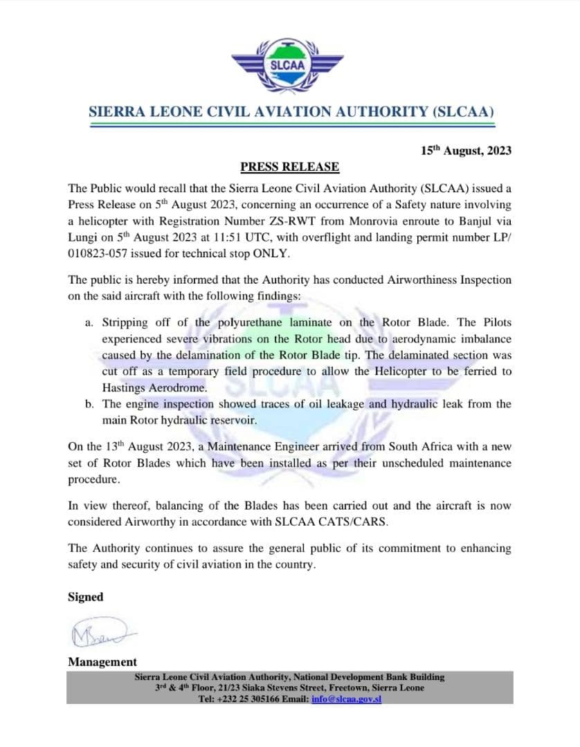 The Sierra Leone Civil Aviation Authority (SLCAA) issued a press release providing an update on the helicopter that ‘crash landed’ near Newton on August 5, 2023.