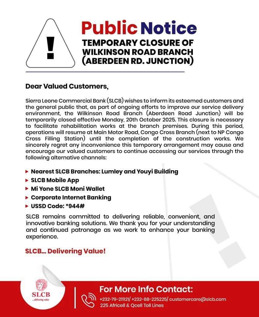 The Sierra Leone Commercial Bank (SLCB) has announced the temporary closure of its Wilkinson Road Branch (at the Aberdeen Road Junction) to facilitate necessary rehabilitation works.