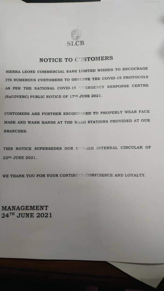 Sierra Leone Commercial Bank Limited wishes to encourage its numerous customers to observe the COVID-19 protocols as per the National COVID-19 Response Centre (NaCOVERC) public notice of 17 June 2021.