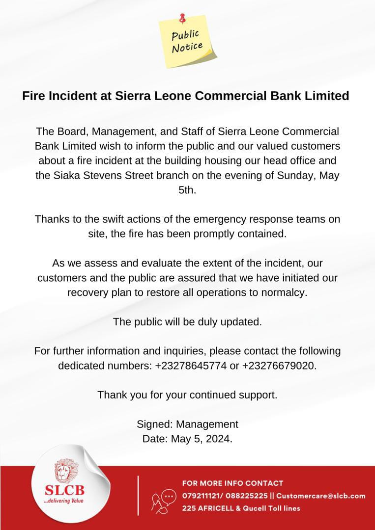The Board, Management, and Staff of Sierra Leone Commercial Bank Limited wish to inform the public and our valued customers about a fire incident at the building housing its head office and the Siaka Stevens Street branch on the evening of Sunday, May 5th.