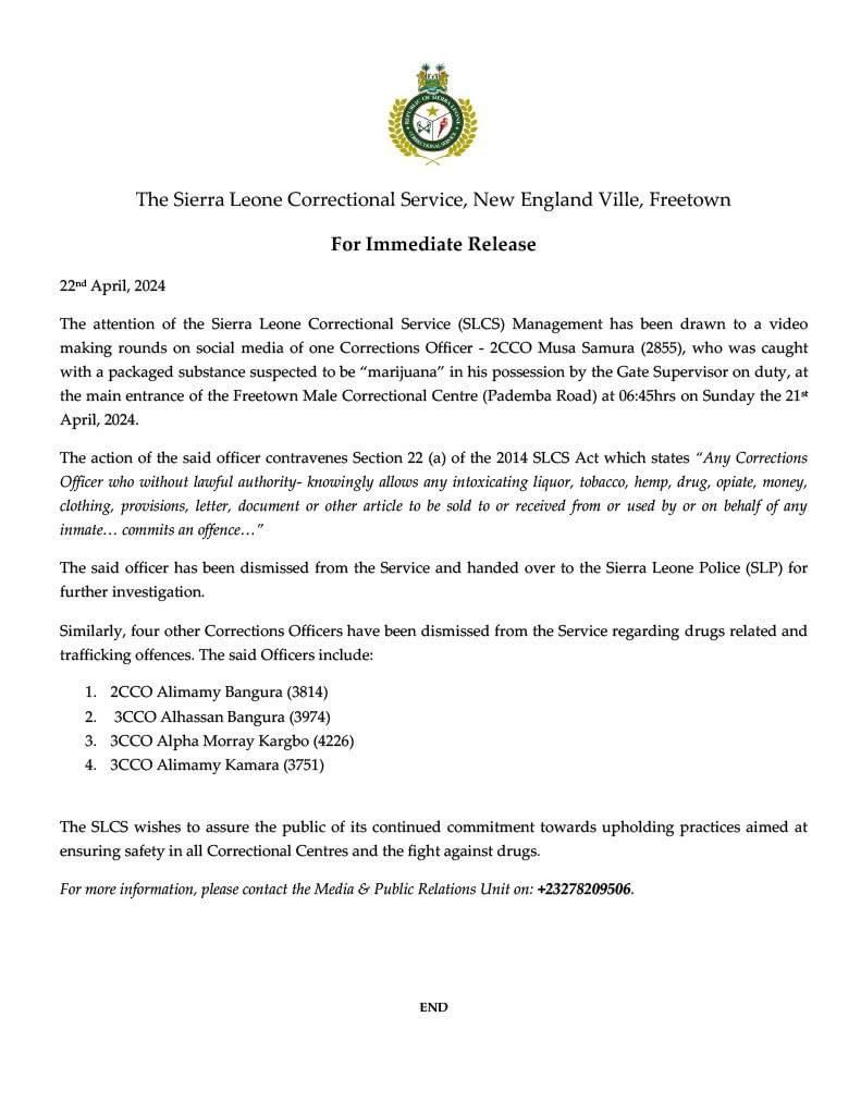 The Sierra Leone Correctional Service (SLCS) has issued a press release addressing the concerning behavior of several officers.