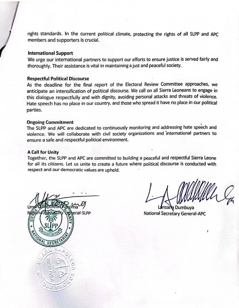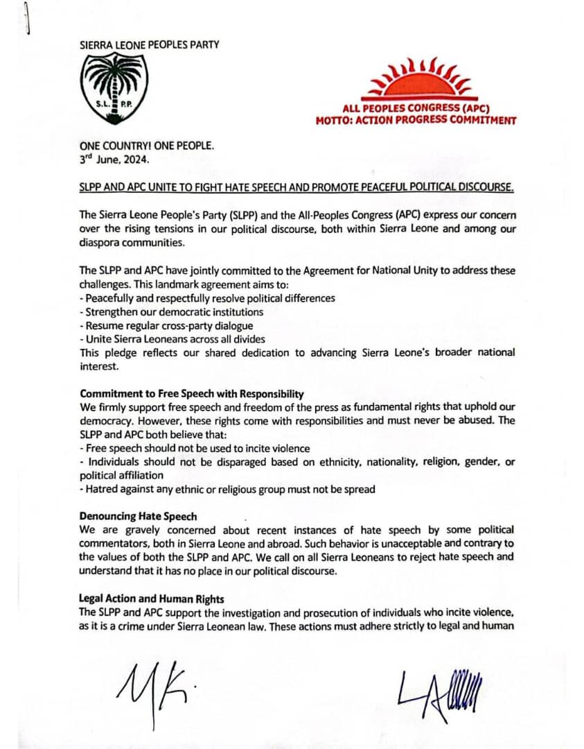 Both parties are gravely concerned about recent instances of hate speech by political commentators in Sierra Leone and abroad. Such behavior is unacceptable and contrary to the values of both the SLPP and APC. They call on all Sierra Leoneans to reject hate speech, which has no place in political discourse.