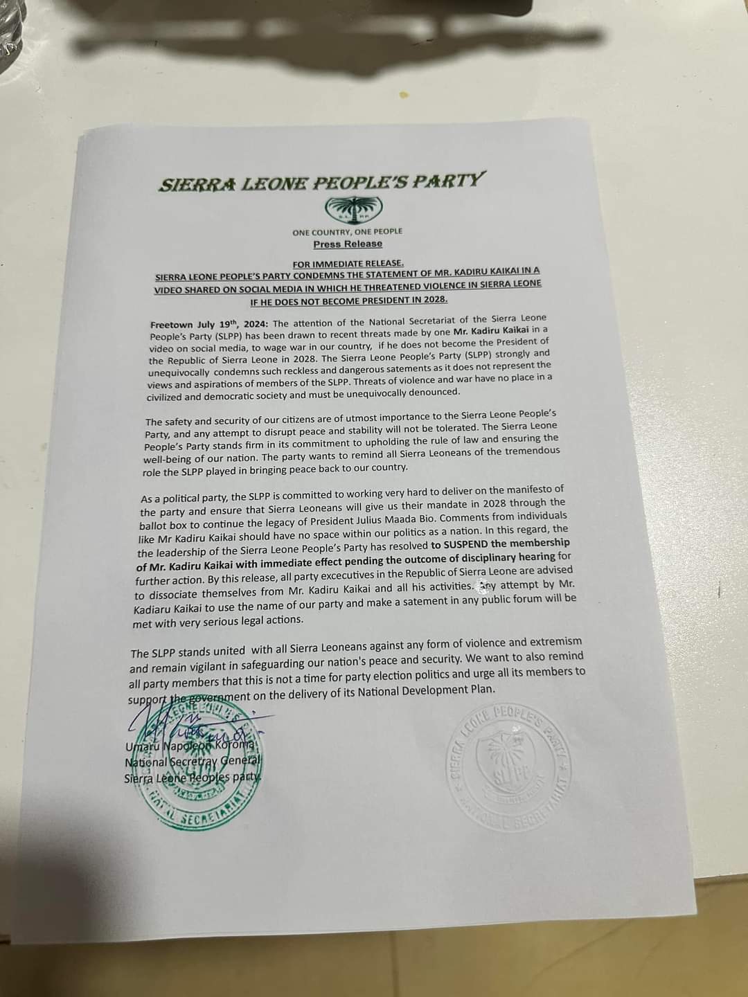 The Sierra Leone People’s Party (SLPP) has officially condemned and suspended Mr. Kadiru Kaikai following a video circulating on social media in which he threatened violence if he does not become president in 2028.