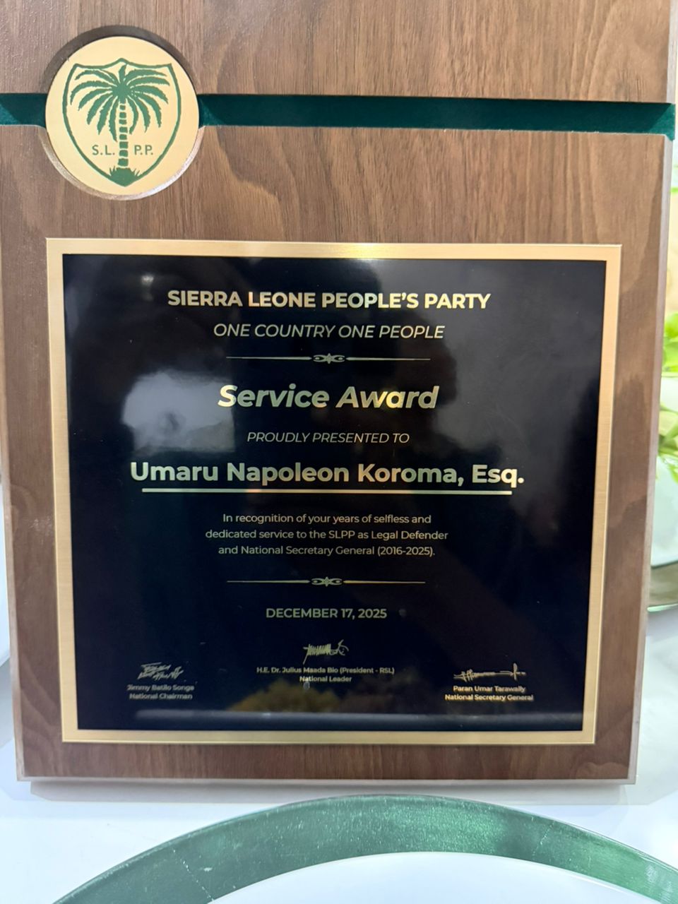 The Sierra Leone People’s Party (SLPP) has conferred a prestigious award on its former Secretary General, Umaru Napoleon Koroma, in recognition of his enduring commitment, institutional stewardship, and transformative contributions to the party’s organizational development.