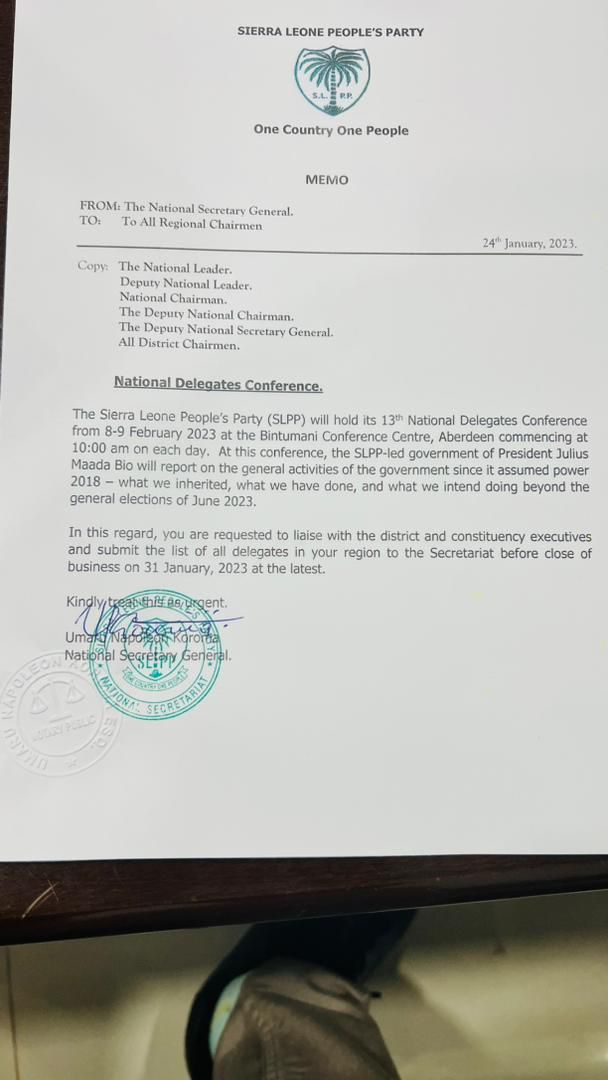 The Sierra Leone People’s Party (SLPP) through its National Secretary General’s office has announced the date for the party’s 13th National Delegates Conference.