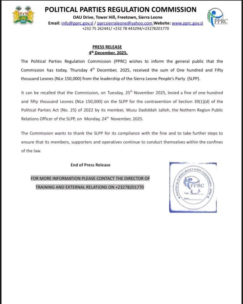 The Sierra Leone People’s Party (SLPP) has complied with a regulatory fine, paying One Hundred and Fifty Thousand Leones (NLe 150,000) to the Political Parties Regulation Commission (PPRC) on Thursday, December 4, 2025.