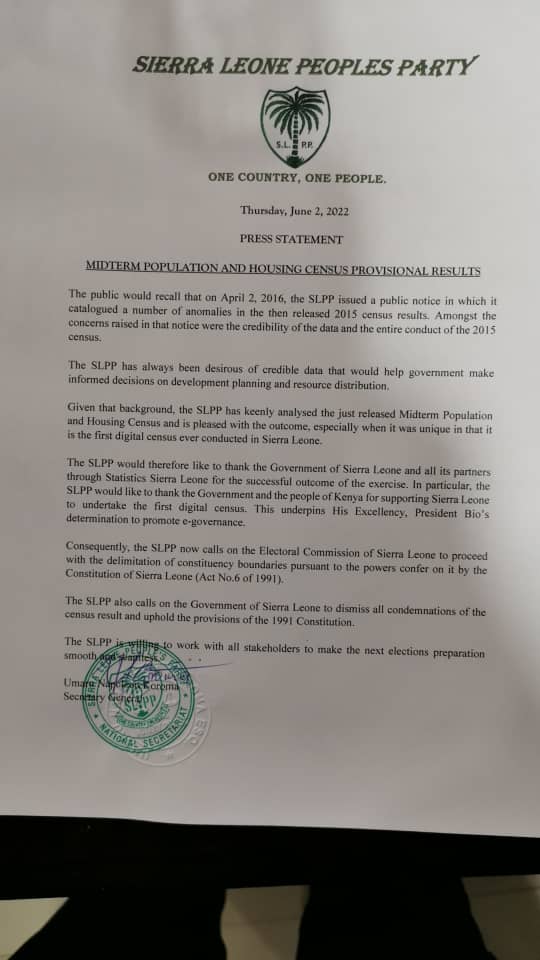The Sierra Leone People’s Party(SLPP) has on a Press Release dated 2nd June, 2022, declared that it is pleased with the outcome of the just released Midterm Population and Housing Census.