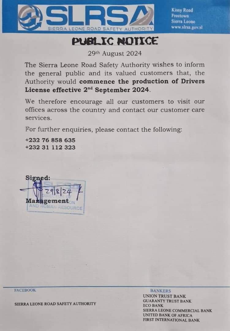 The Sierra Leone Road Safety Authority (SLRSA) has announced that it will officially begin the production of driver’s licenses on September 2, 2024.
