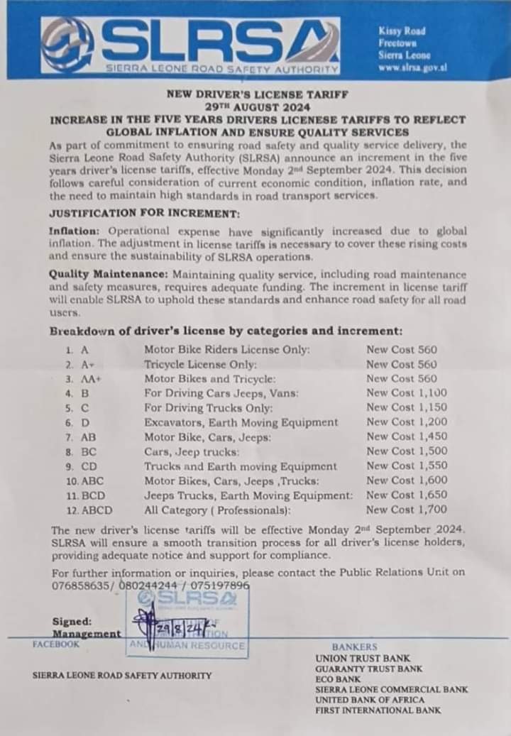 The Sierra Leone Road Safety Authority (SLRSA) has announced a new tariff structure for five-year driver’s licenses, set to take effect on Monday, September 2, 2024.