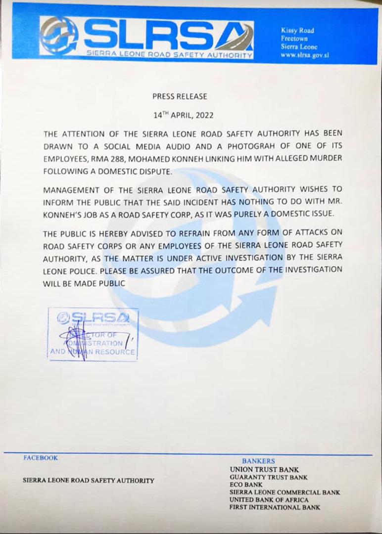 The Sierra Leone Road Safety Authority has issued out a Press Release with regards the news about one of its employees, Mohamed Konneh, who allegedly murdered a man over some domestic dispute, being a wanted criminal.