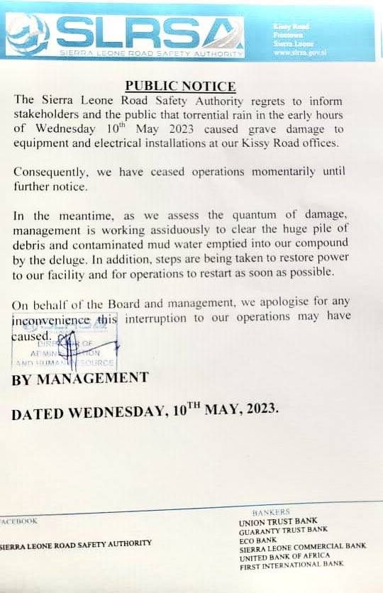 The Sierra Leone Road Safety Authority (SLRSA) has informed stakeholders and the public through a public notice that severe rainfall occurred in the early hours of Wednesday, May 10, 2023, causing significant damage to the equipment and electrical installations at their Kissy Road offices.