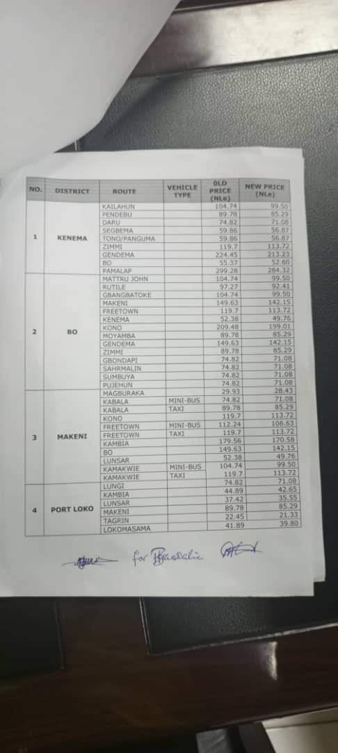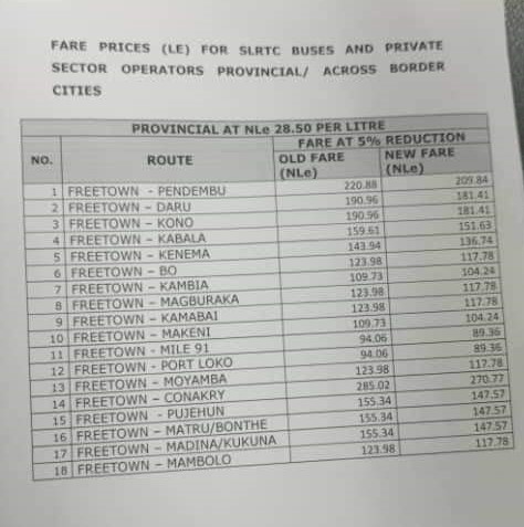 Following the reduction in the price of fuel in the country on the 30th June 2024, the Sierra Leone Road Transport Cooperation-SLRTC has made and published an adjustment reduction of 5% in the transportation prices in the country.