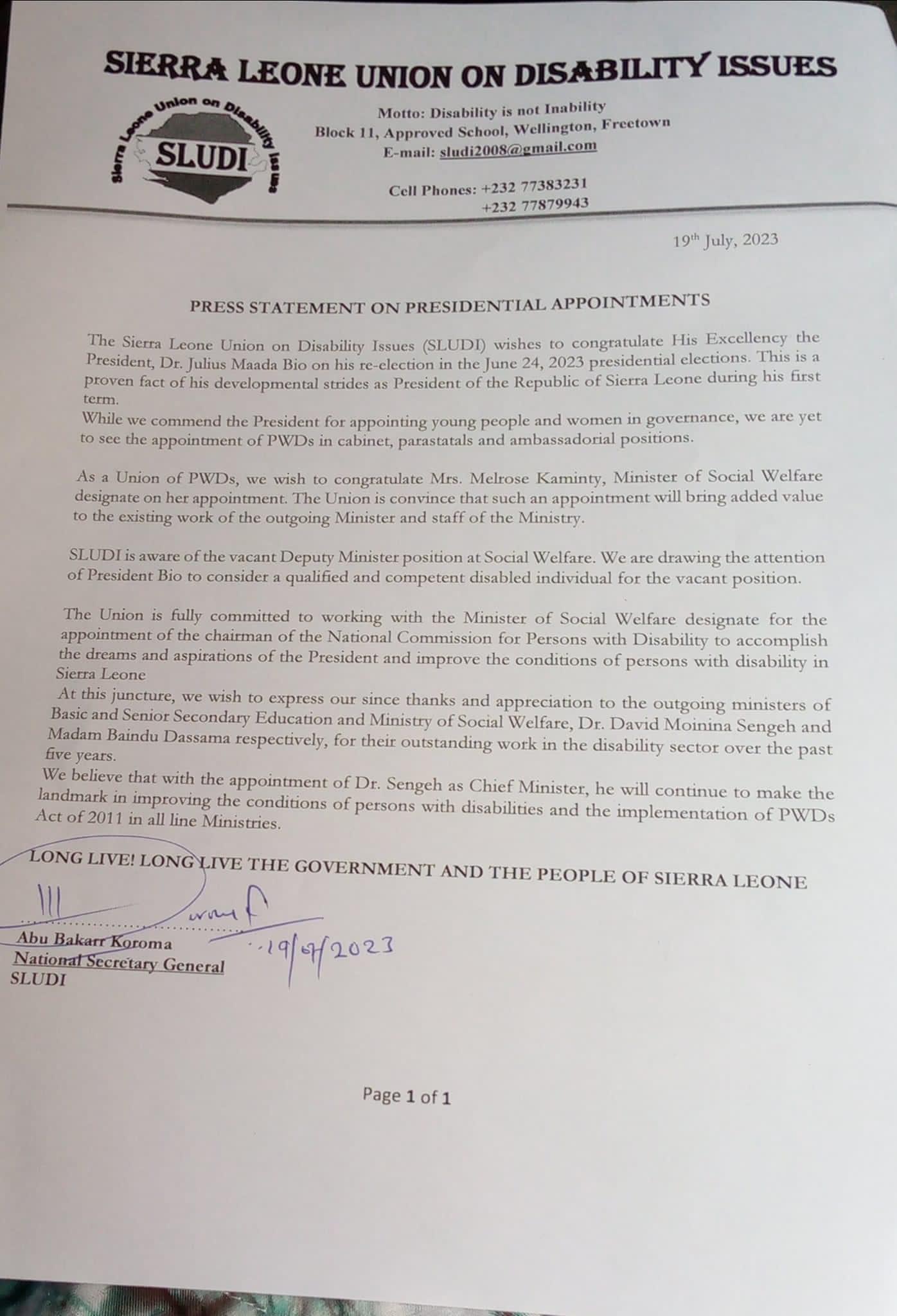 In a recent press release, the Sierra Leone Union on Disability Issues (SLUDI) has called upon President Bio to appoint a person with a disability as the Deputy Minister of Social Welfare.