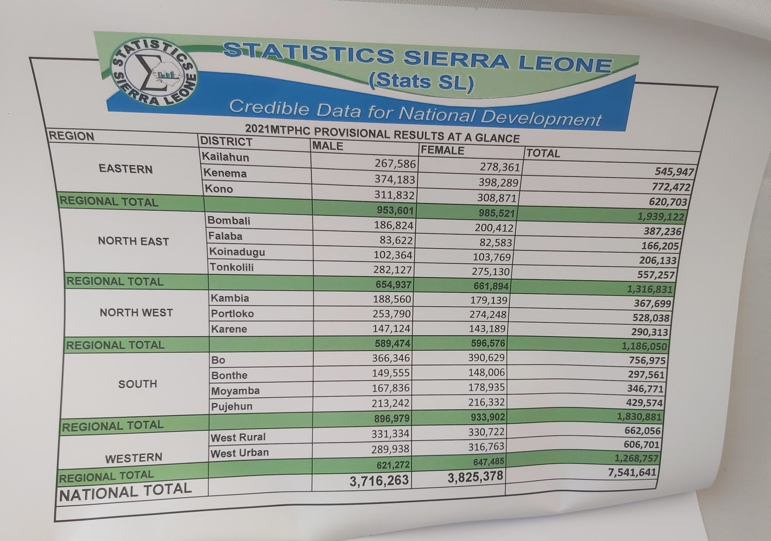 The results came following the conduct of the first ever digital census in Sierra Leone, in the form of the Mid-Term Population and Housing Census.