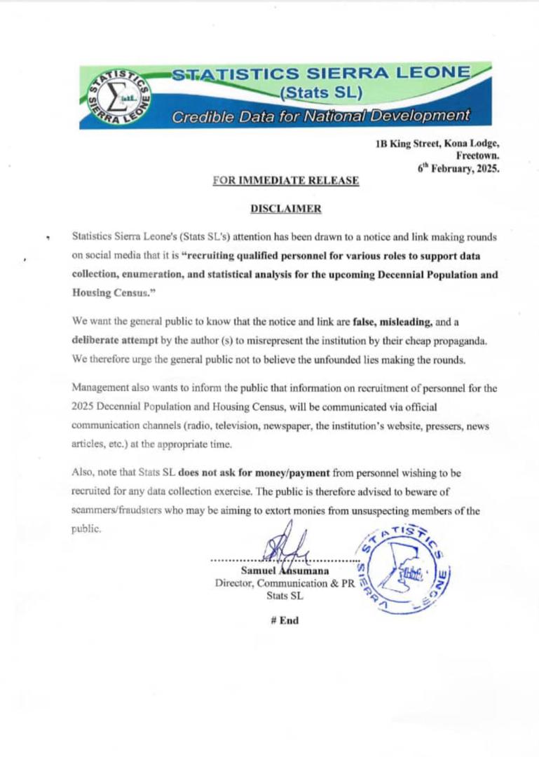 Statistics Sierra Leone (Stats SL) has issued a disclaimer regarding a fraudulent recruitment notice circulating on social media.