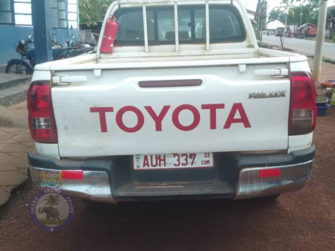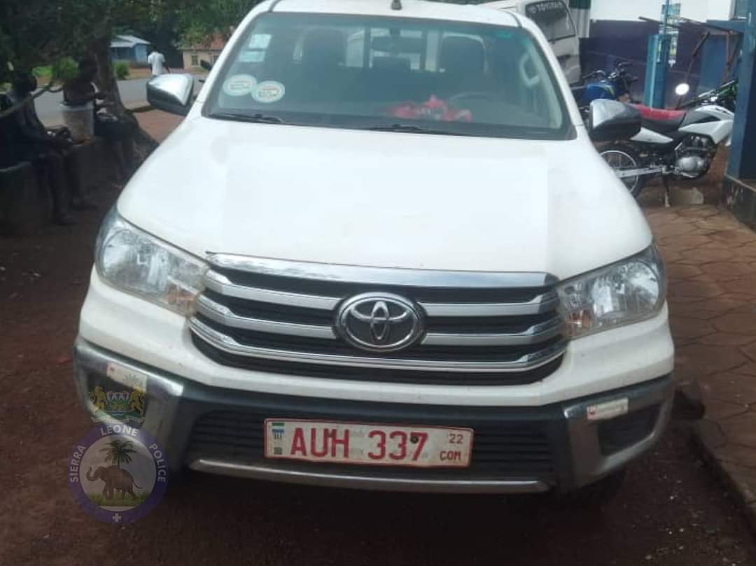 Inspector Yansaneh and his searching team intercepted a white Toyota Hilux with registration number AUH 337, which raised suspicions of being stolen or unlawfully obtained. The driver, identified as Abu Bakarr Koroma from Mile 91 Town, was taken into custody for further questioning.