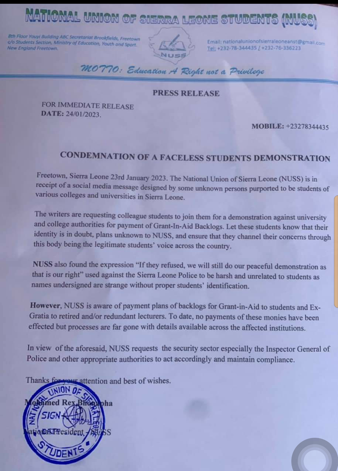 The National Union Of Sierra Leone Students (NUSS) has distanced themselves from an alleged students’ demonstration for the issues of ‘’Grant-In-Aid Backlogs’’, which authorities of different Colleges and Universities have not yet paid.