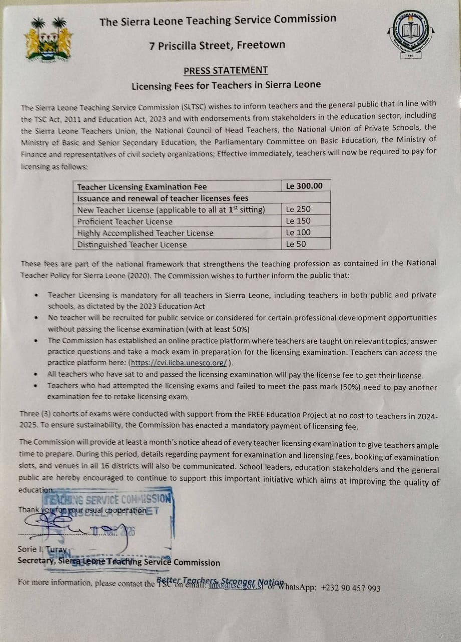 The Sierra Leone Teaching Service Commission has announced the formal introduction of mandatory licensing fees for all teachers across the country.