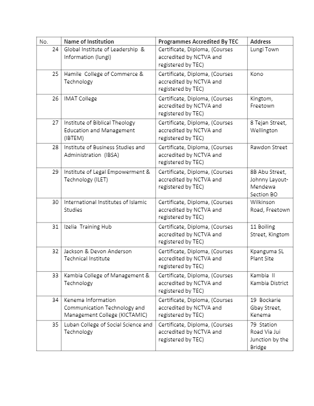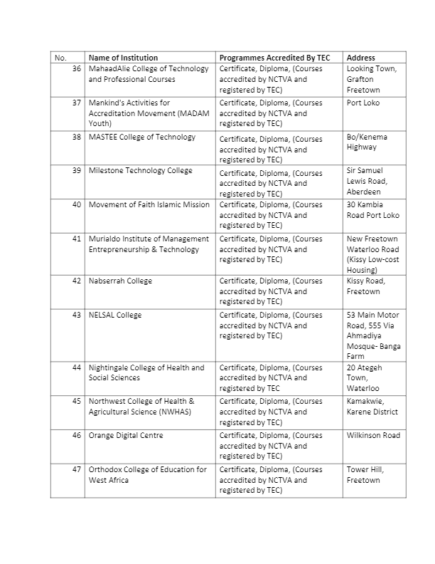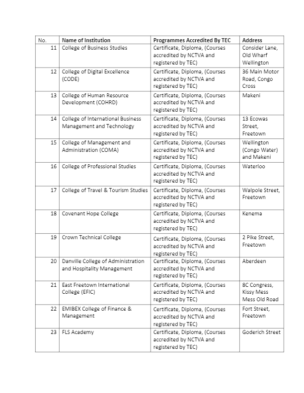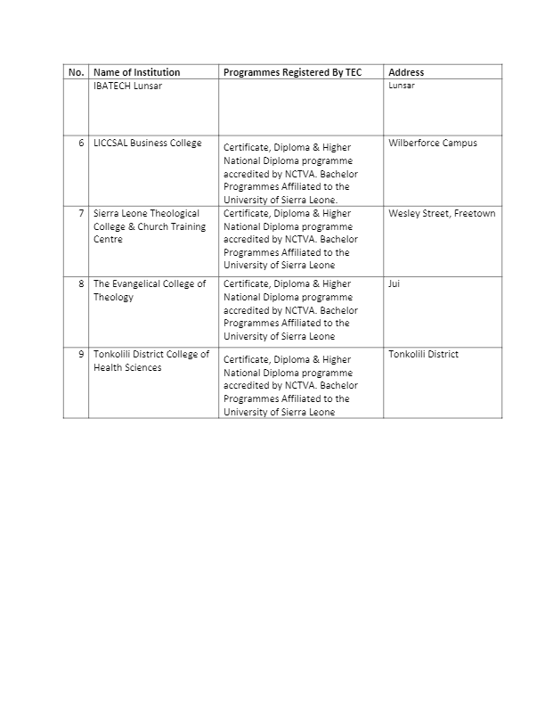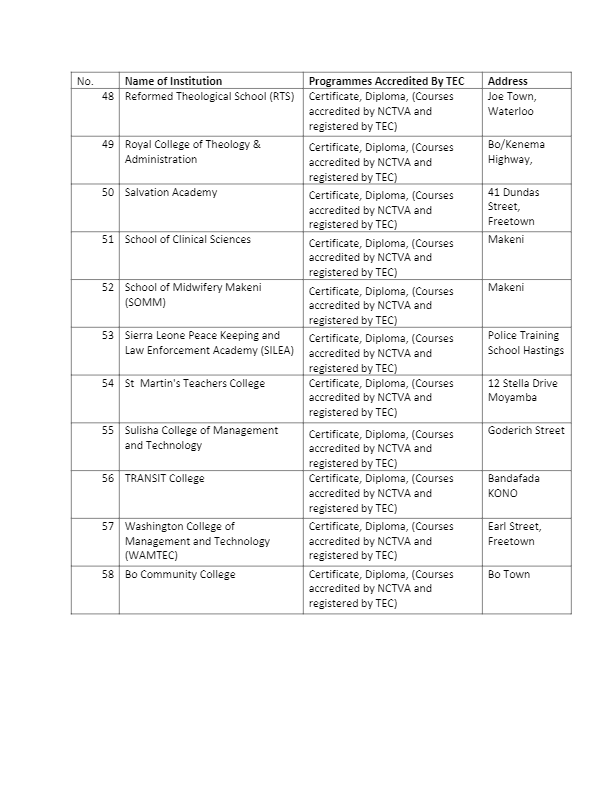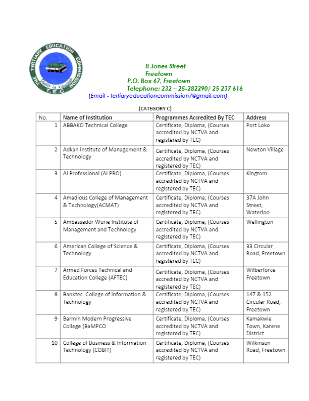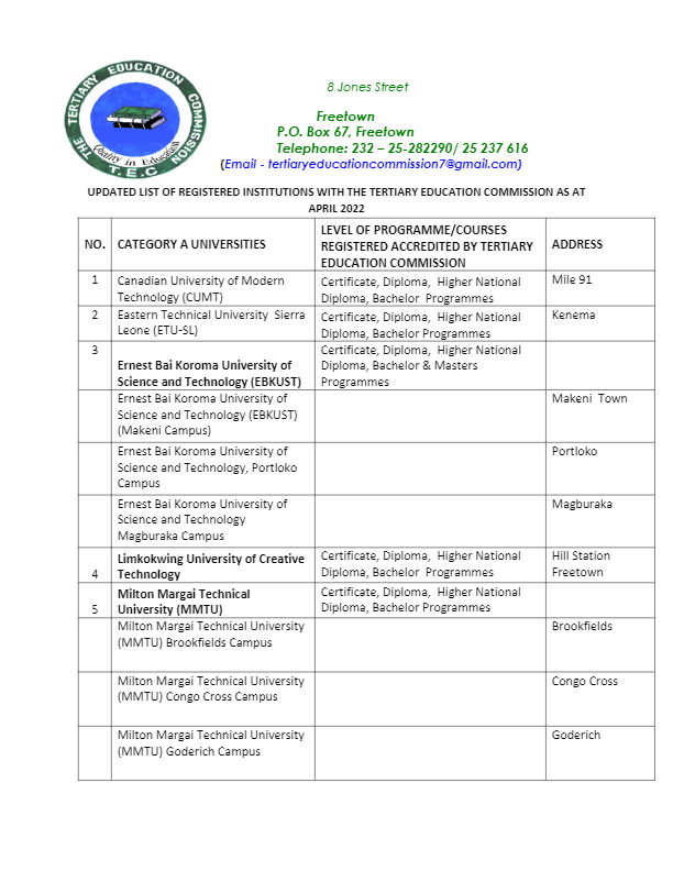 The Tertiary Education Commission (TEC) has released the full list of registered institutions in Sierra Leone with the commission as at April 2022.