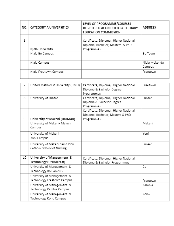 Category A comprises of Njala University, Fourah Bay College (FBC), College of Medicine & Allied Health Sciences (COMAHS), Milton Margai Technical University and others.