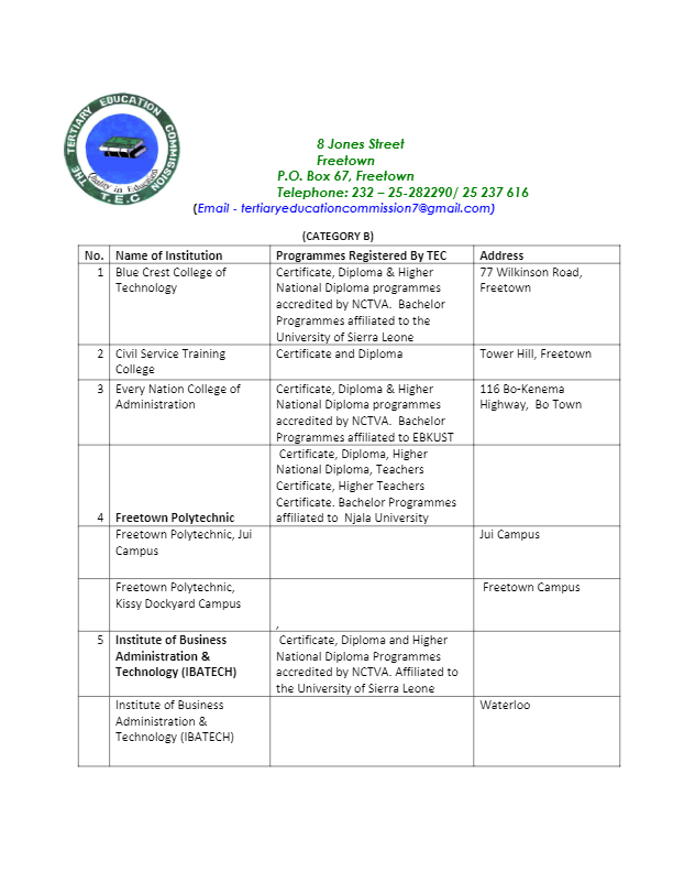 Category B comprises of Blue Crest College of Technology, Freetown Polytechnic, Institute of Business Administration & Technology (IBATECH), LICCSAL Business College and others.