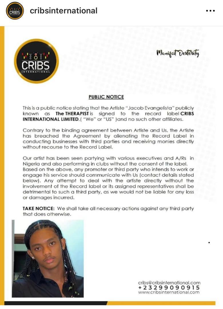 With dismay on the said of Cribs, in a public notice, noted that the artiste “Jacob Evangelista” publicly known as The Therapist is signed to the record label Cribs International Limited.
