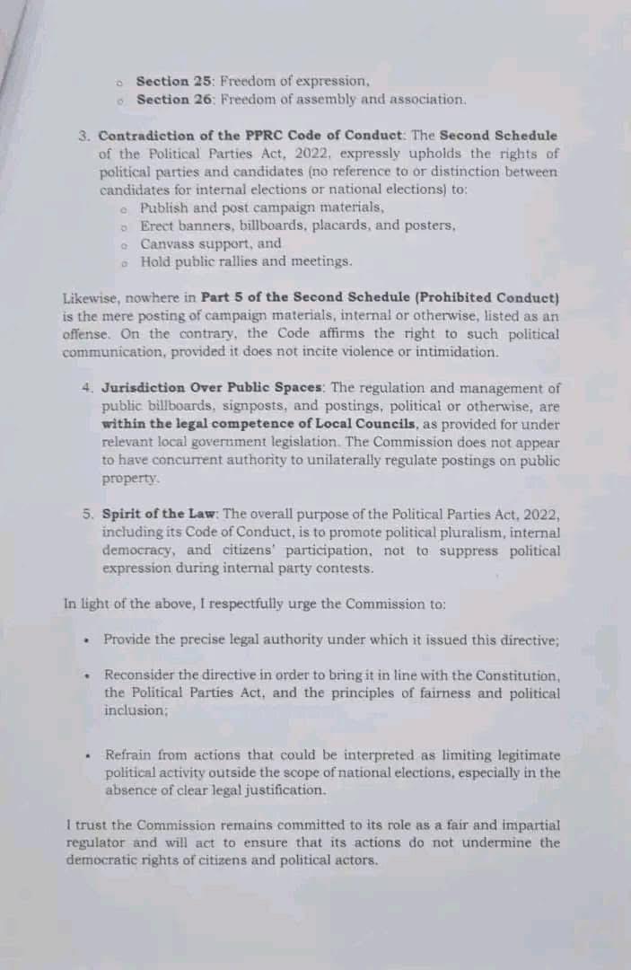 In his letter, Timbo acknowledged the PPRC’s constitutional role in regulating political parties but challenged the legality of the directive. He raised several concerns, including: