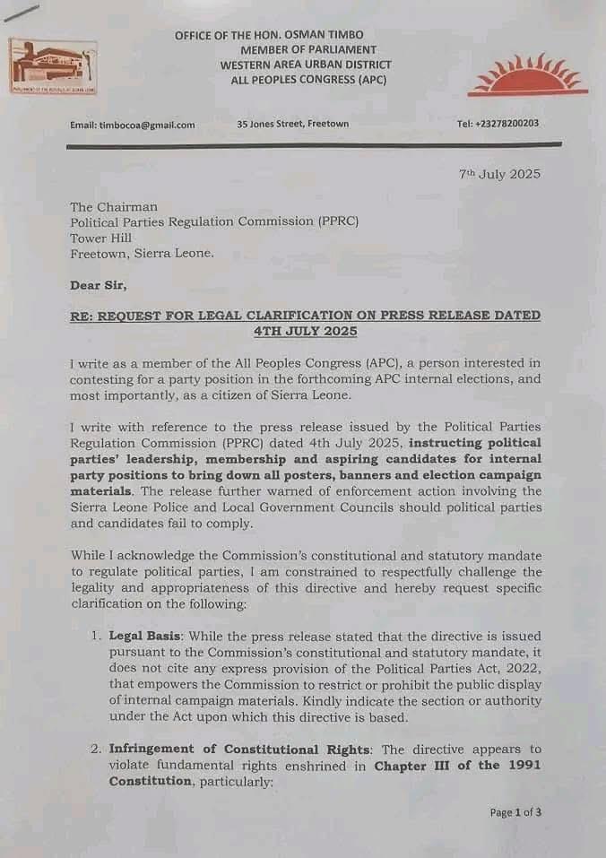 Osman Timbo, a member of the All Peoples Congress (APC) and an aspiring candidate for an internal party position, has formally requested legal clarification from the Political Parties Regulation Commission regarding a press release dated July 4, 2025. The release directed political parties to remove all posters, banners, and campaign materials and warned of enforcement actions by the Sierra Leone Police and Local Government Councils for non-compliance.