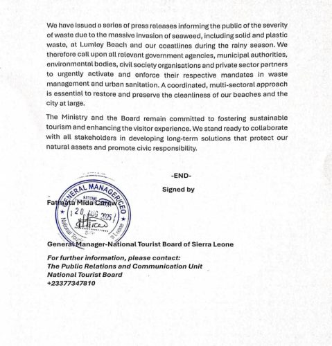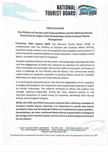 According to the press release, despite sustained efforts over the years, including daily cleaning exercises and the engagement of beach bar operators to maintain the cleanliness of their immediate surroundings, the current state of the beach continues to pose a challenge for the Ministry and the Board. Its added that the unfortunate reality undermines their collective aspiration to position Sierra Leone as a premier destination for both local and international visitors.