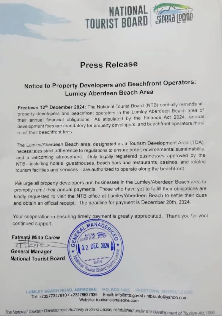 The National Tourist Board (NTB) has issued a reminder to property developers and beachfront operators in the Lumley-Aberdeen Beach area regarding their annual financial obligations, as mandated by the Finance Act 2024.