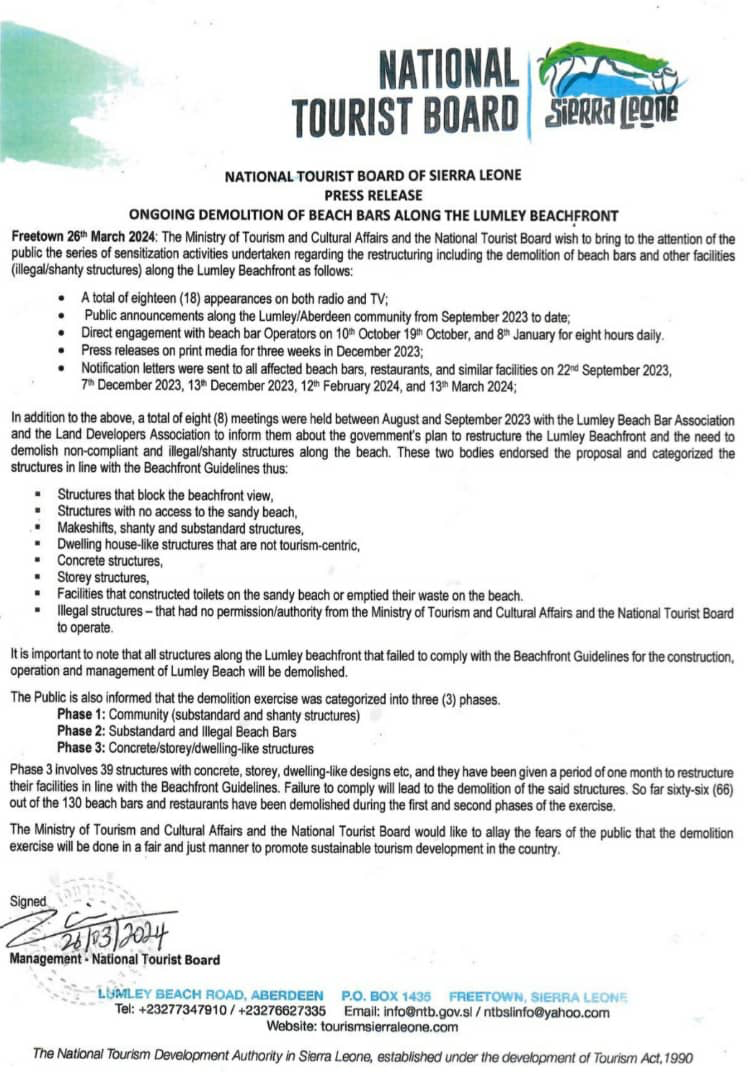 This press release serves as a reminder of the government’s commitment to enhancing the tourism sector while ensuring compliance with regulations and guidelines for the betterment of Sierra Leone’s coastal areas.