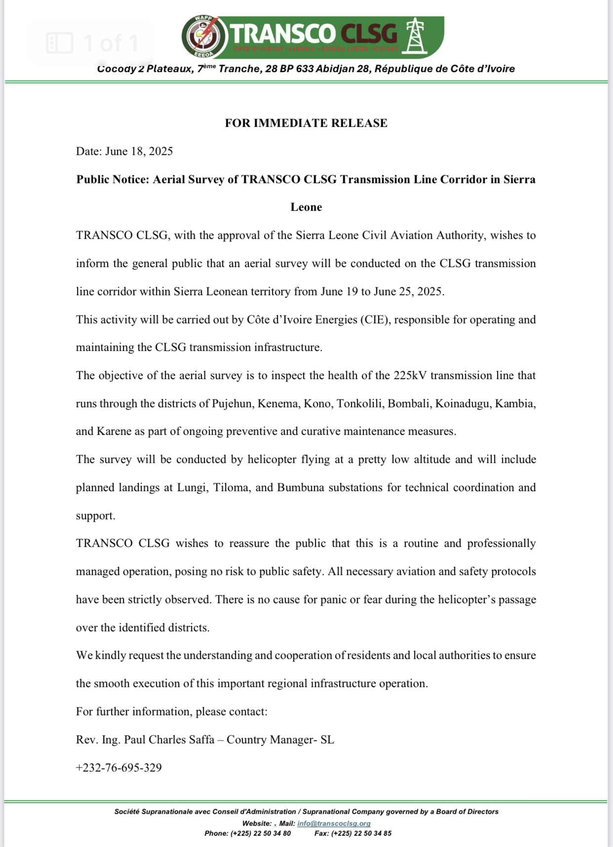 The Regional Transmission Company of Côte d’Ivoire-Liberia-Sierra Leone-Guinea (TRANSCO CLSG) has announced an aerial survey of the CLSG transmission line corridor within Sierra Leone from June 19 to June 25, 2025.