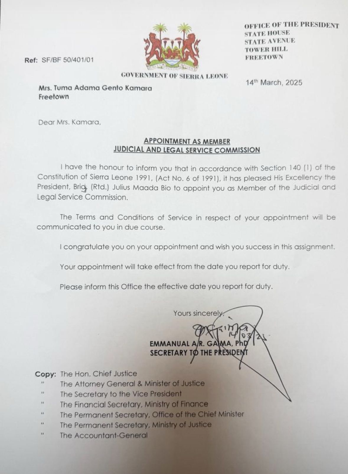 The letter, signed by Secretary to the President, Dr. Emmanuela A.R. Gaima, informed Mrs. Kamara of her new role, stating that the terms and conditions of service would be communicated to her in due course.