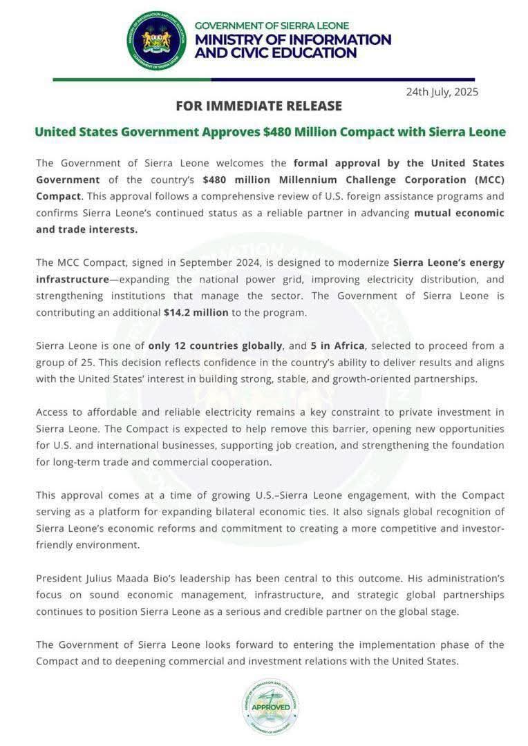 The Government of Sierra Leone has officially welcomed the United States Government’s approval of a $480 million Millennium Challenge Corporation (MCC) Compact, a landmark investment aimed at transforming the country’s energy sector and deepening U.S.-Sierra Leone economic relations.