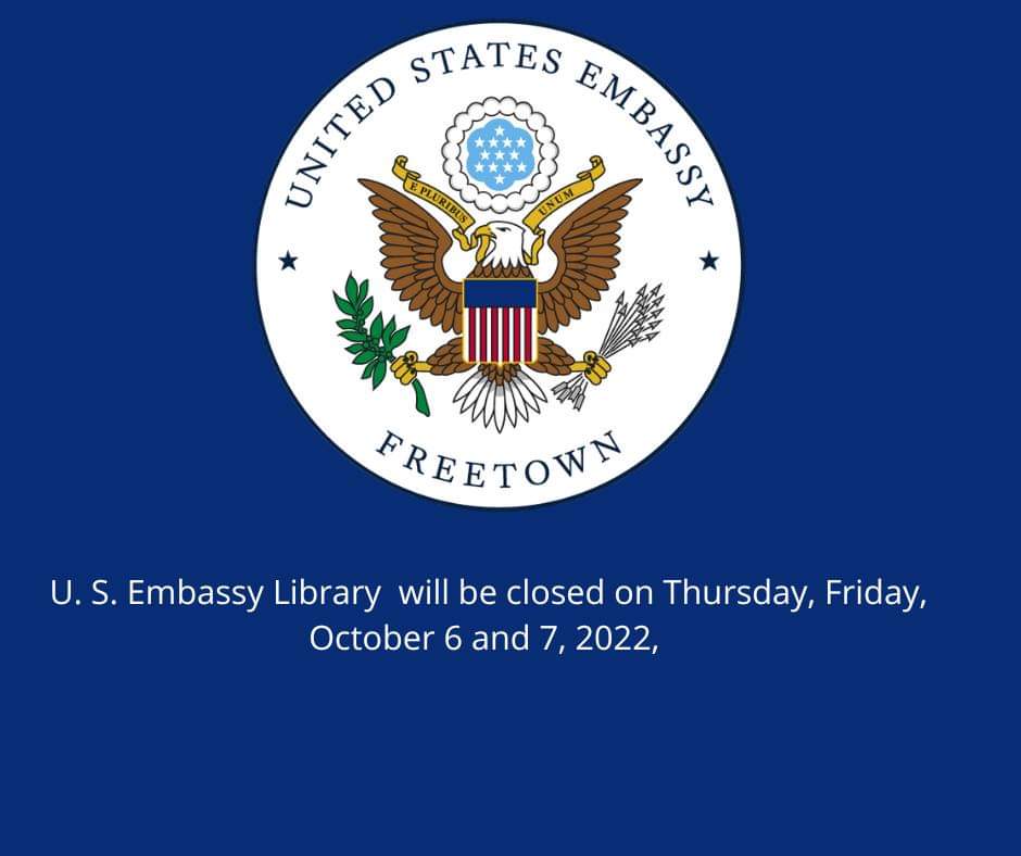 U. S. Embassy in Sierra Leone has announced that the Library will be closed on Thursday, 6 October and Friday, 7 October 2022 respectively.