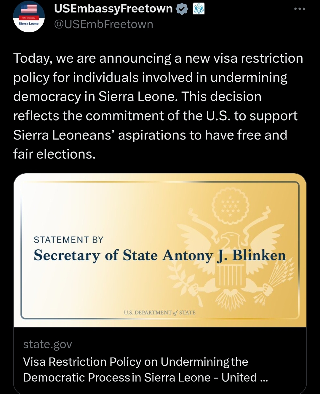 The United States has declared the implementation of a stringent visa restriction policy targeting individuals involved in undermining the democratic process in Sierra Leone.