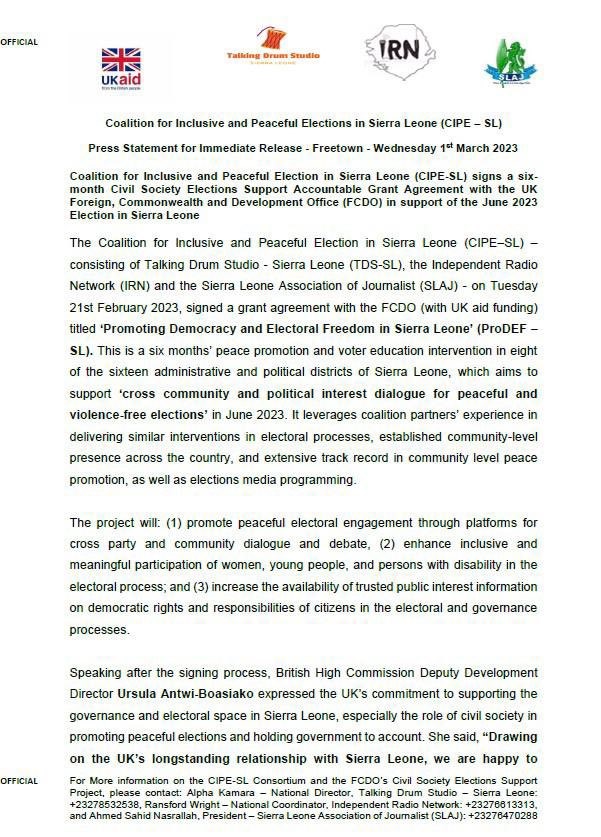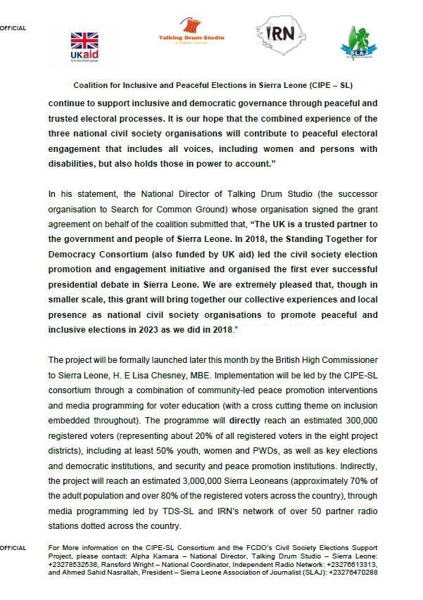 The UKAid had recently announced partnerships with CIPESL, TDSSALONE, SLAJ, and IRN respectively. This partnership is aimed at supporting cross-community and political interest dialogue for peaceful and violence-free elections in June 2023.