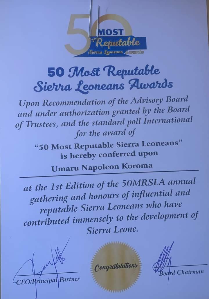 He was awarded as reputable Sierra Leonean who has contributed immensely to the development of Sierra Leone.